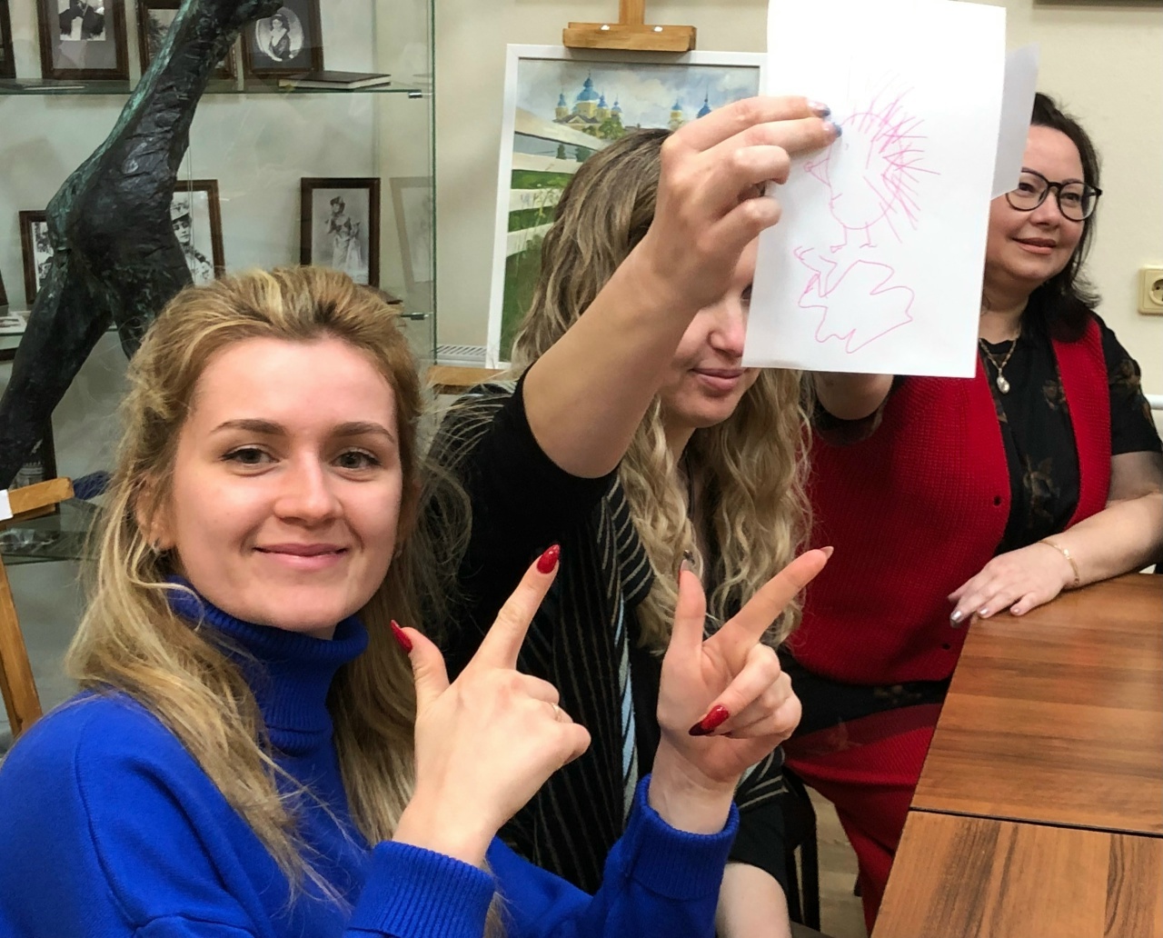 Вскоре атмосфера в галерее стала чрезвычайно творческой. Специальная анкета «Давайте познакомимся» помогла преодолеть стеснение. Затем последовали игры «Грузовик и мотор» (на доверие), «Вороны и совы» (на быстроту реакции), «Радиус слова» (расслабление), «Фотограф и фотоаппарат» (на внимательность), «Художники» (на умение работать в паре) и другие.