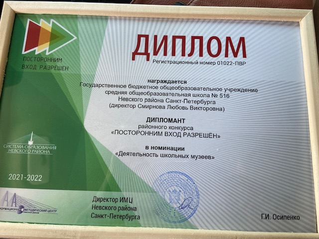 22 апреля 2022 года музейная деятельность ГБОУ СОШ №516 была отмечена в конкурсе "Посторонним вход разрешён". Школьный музей "Живая история" стал Дипломантом этого конкурса.