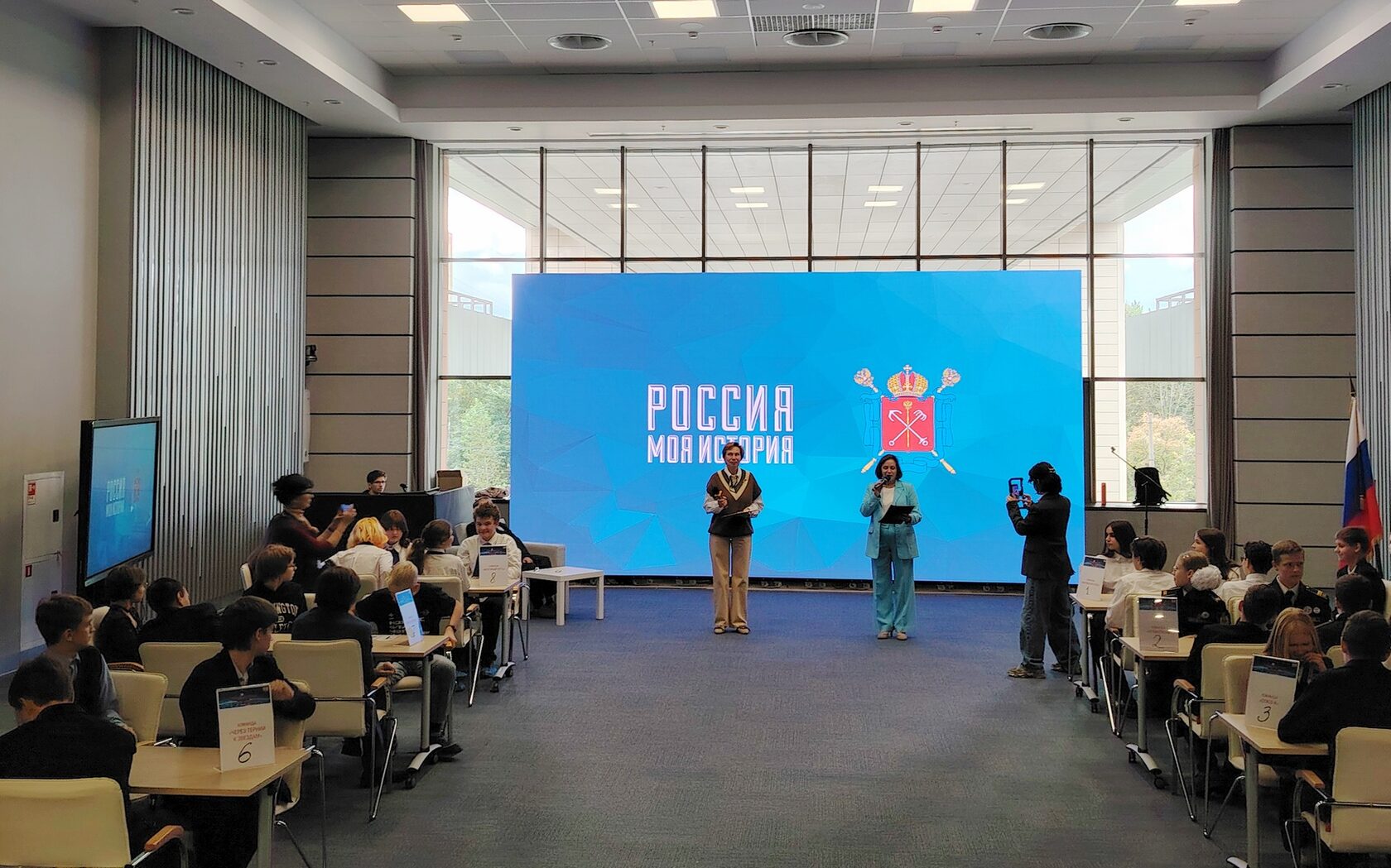 Ведущие — руководитель проектов Санкт-Петербургской региональной организации Общероссийской общественной организации «Федерация космонавтики России» Ирина Анатольевна Исаева и член координационного совета Общественной организации «Патриотический проект «Памяти предков будем достойны» Ольга Александровна Бабенко.